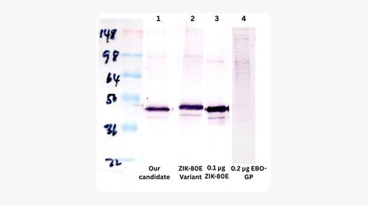 Fig 1. Proof of Expression: The Western Blot probed with Rabbit anti-ZIK-80E antibody. Our candidate (First lane) expresses at high levels, comparable to the two positive controls (Second lane - highly expressed variant expressed in the same conditions, third lane - 0.1 μg ZIK-80E). Despite heavy mutations,
